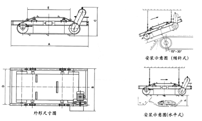 RCDD干式自卸式電磁除鐵器外形尺寸、安裝示意圖。